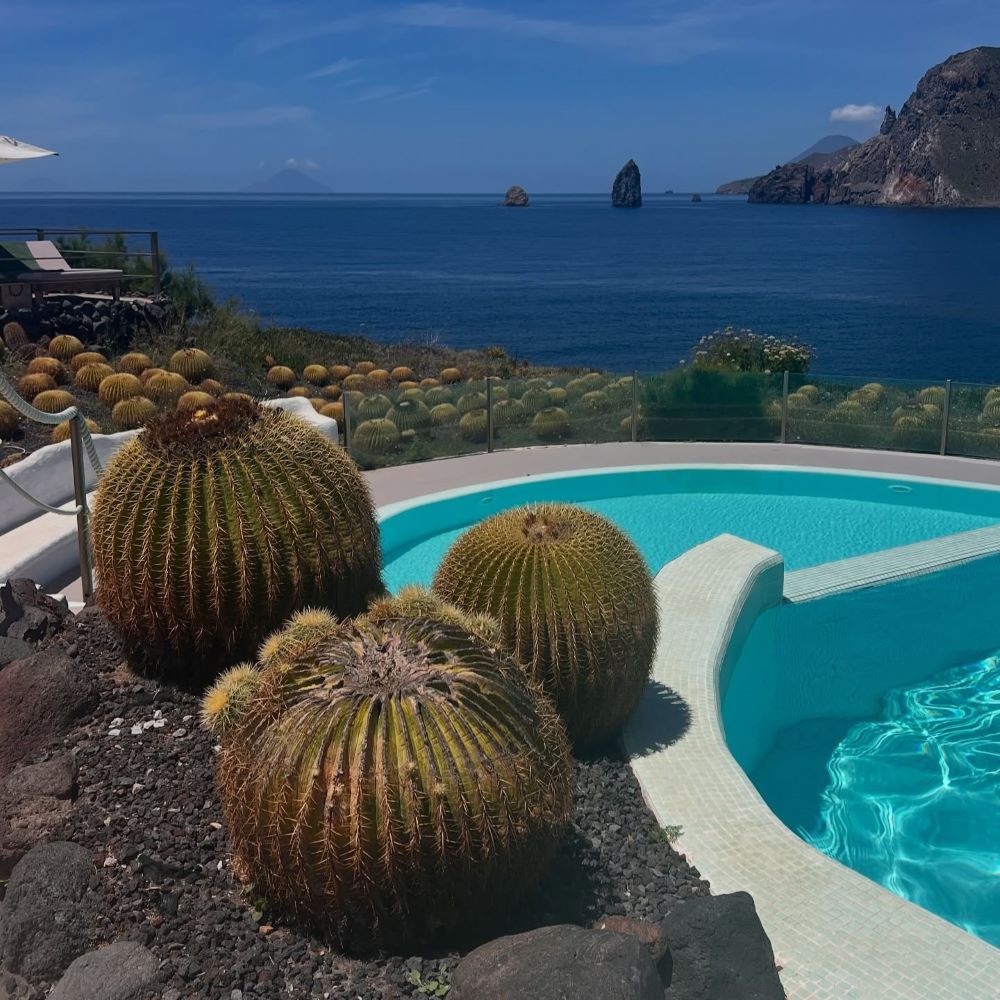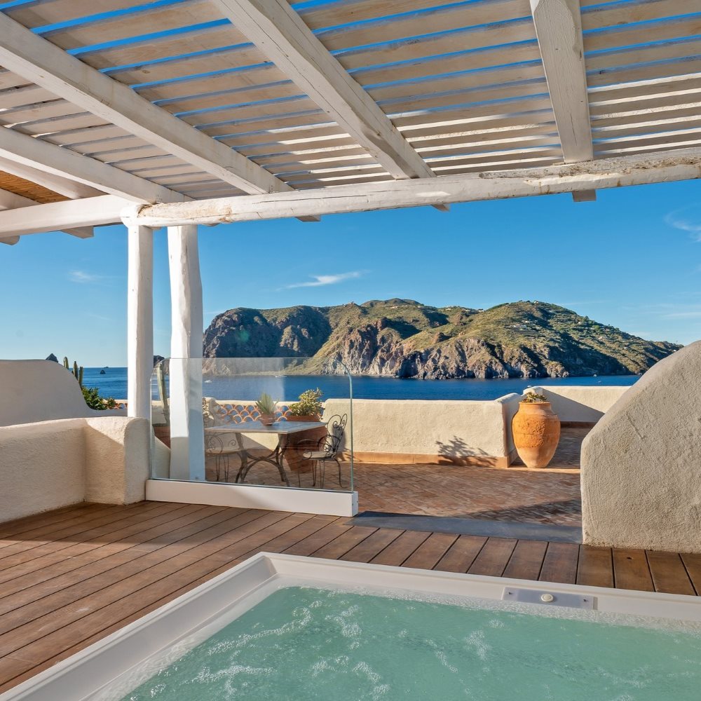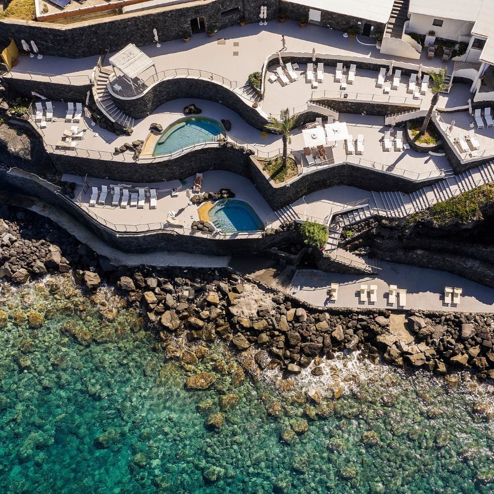Inutile d’être géologue pour deviner le genre d’île qu’est Vulcano. Sable noir, côtes rocheuses et paysages spectaculaires façonnent cette île éolienne située au large de la côte nord sicilienne. C’est sur son flanc septentrional que s’est logé le Therasia Resort Sea and Spa, dont les piscines à débordement forment des cascades d’eau salée d’où vous contemplerez, à travers un étroit détroit, Lipari, l’île voisine située à moins d’un kilomètre de là.