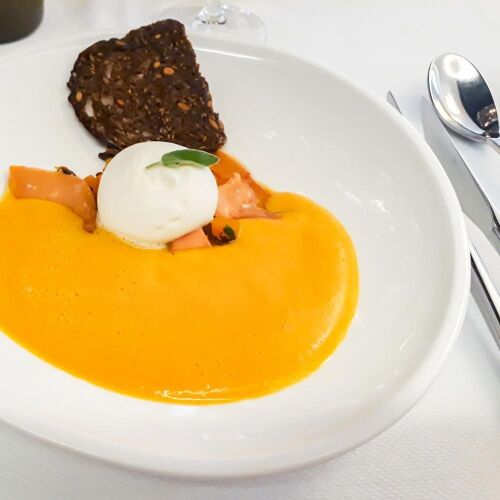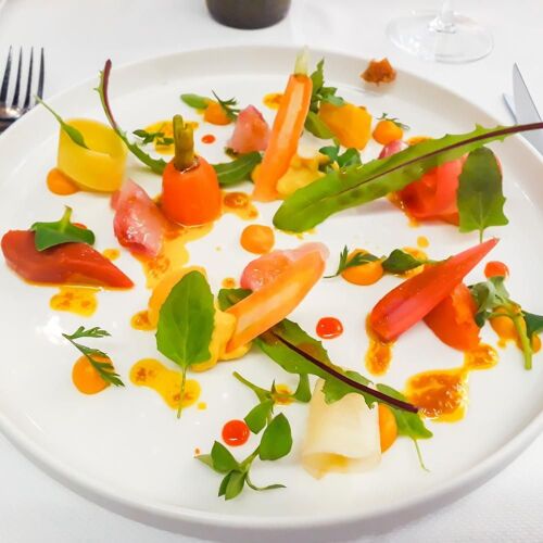 Christophe Comes ou la passion du végétal ! Voilà un chef authentiquement investi dans ses deux potagers et ses collections d’agrumes et d’oliviers (des variétés endémiques dont il tire ses huiles d'olive). Dans l’assiette, la note végétale s’impose du début à la fin avec finesse et intensité. La pluralité de concombres épineux, sashimi de thon blanc et shiso décline le légume de mille et une manières au gré d’assaisonnements qui montent en puissance ; la dorade s’offre sur un jus de bouillabaisse anisé au fenouil sauvage, escortée de courgettes, de basilic et d’une rouille aillée façon aïoli. Des fraises du jardin s’épanouissent sur un biscuit joconde à l’amande, coiffées d’un smoothie et d’un sorbet fraise, avec gelée, ganache chocolat blanc-vanille et, en satellite, une glace à la flouve sur crumble.