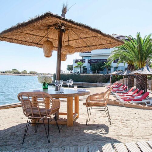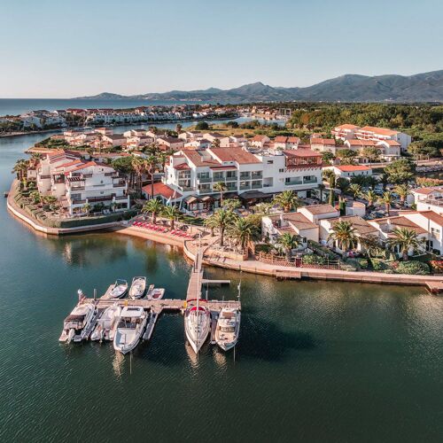 Un site pour le moins étonnant que cette île artificielle séparée de la Méditerranée par un cordon littoral, et qui abrite un complexe hôtelier avec piscine et spa. La terrasse au bord de l’eau séduit, tout comme la cuisine généreuse du chef Frédéric Bacquié, qui privilégie les beaux produits du terroir catalan et de la pêche locale. Justesse des assaisonnements et maîtrise des cuissons sont bien au rendez-vous, dans des assiettes précises et élégantes : saint-pierre de la pêche d’Olivier à Argelès-sur-Mer, basilic, courgette et sauce au verjus ; rouget de roche, filet contre-filet, légumes d’Adrien ; figue de Saint-Génis-des-Fontaines à la vanille et au Banyuls… Le menu déjeuner offre un très bon rapport qualité-prix et, en complément, l’Aquarama propose une cuisine gourmande dans une version bistrot chic.