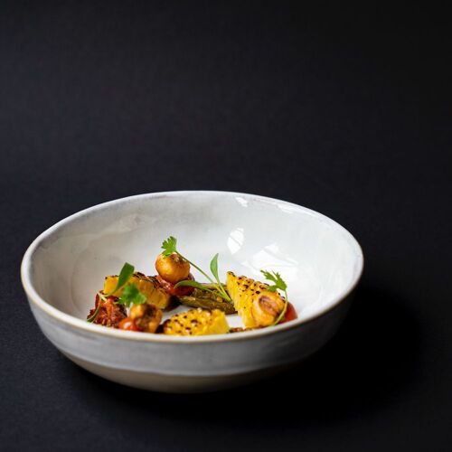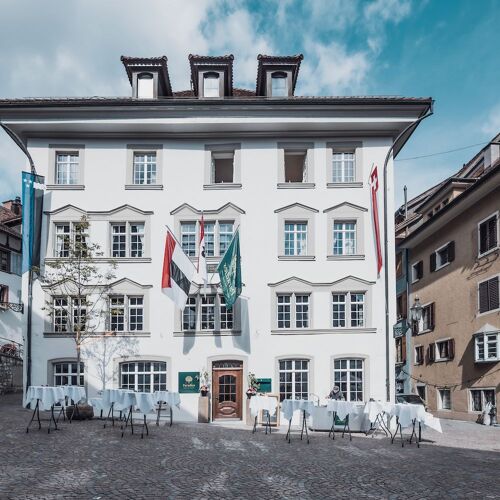 The former guild house dating from 1616 beautifully marries historical and modern elements in the old town. In the comfort of a tasteful space with a striking original wooden coffered ceiling, diners are invited to enjoy a seasonal set menu in which regional ingredients meet international influences. It comprises four to seven courses and is also available in a vegetarian version. Service is gracious and professional – even the chef gets involved front of house. There is also a bar and cigar lounge. In summer, you can dine al fresco on the small cobblestone square that fronts the building.
