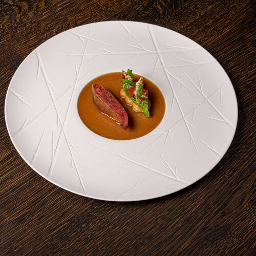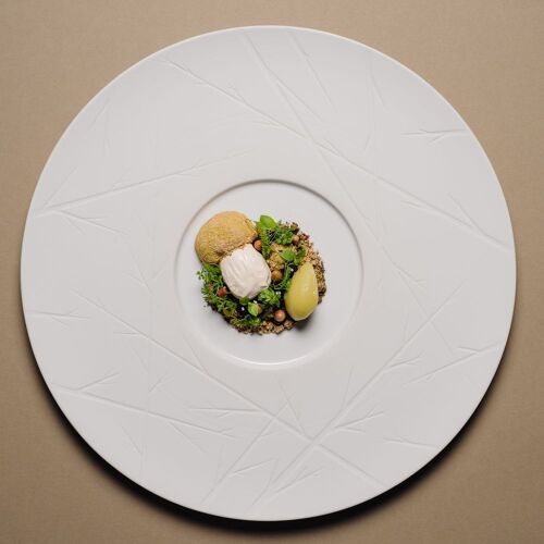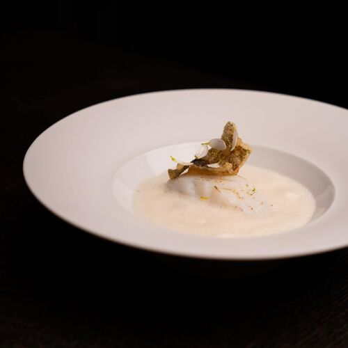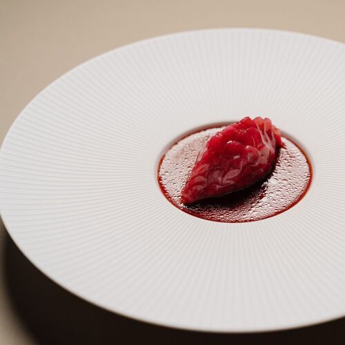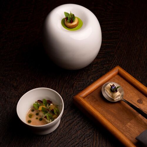 A lift sweeps you up to the first floor, where you will be seated at one of the upscale wooden tables in a minimalist chic setting done out in elegant dark tones. The fully visible open kitchen serves as the focal point. Kevin Romes and sous-chef Pascal Hobler, both with experience at MICHELIN-starred establishments, lead a team that crafts a six-course set menu (Wed and Thu, a four-course option is also available) with the possibility of adding an extra course. The modern, creative dishes showcase remarkable artistry – stripping things down to the essentials while still integrating intricate details, as seen in the striking flavour contrasts of Appenzeller duck, persimmon and aubergine, or the intriguing textural combinations in borscht, smoked eel and beetroot – a delight both for the eyes and the palate! Adept service is provided by a friendly but unobtrusive team – the chefs personally present each dish. The well-curated wine list is anything but run-of-the-mill. That said, the fantastic non-alcoholic pairings for the set menu, featuring unique creations, are a highlight.