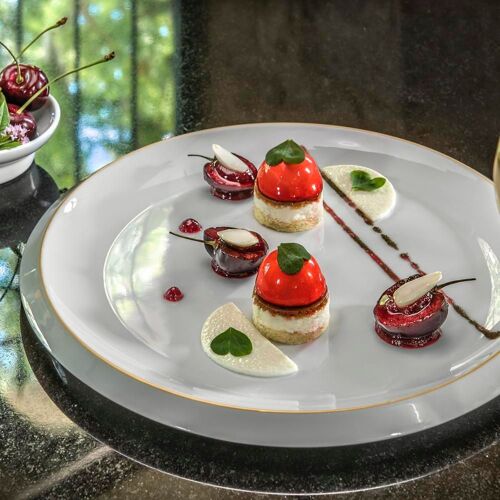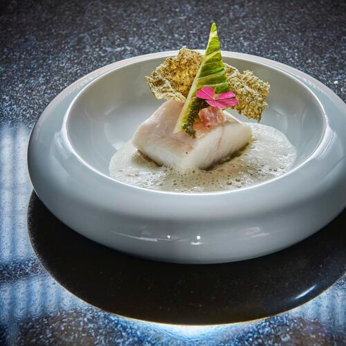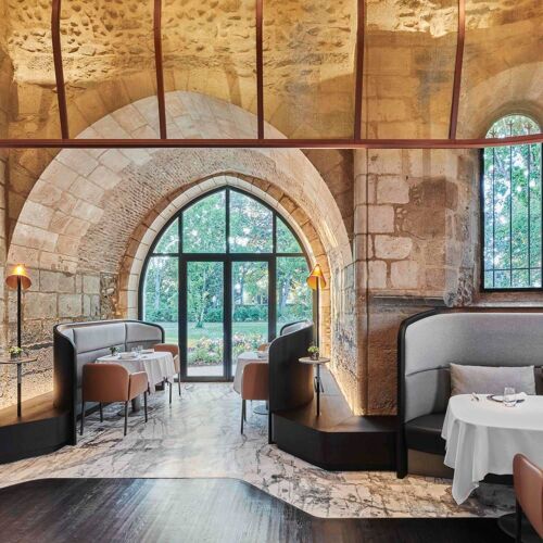 The restaurant of Château Saint Jean stands out first by its unexpected location in a former chapel, the nave of which is clad in copper lacework panels for an almost snug feel, sporting a surprising, highly successful marriage of periods! The food is of the same ilk and chef Olivier Valade more than demonstrates that his star-studded background (Loiseau, Darroze) owes nothing to chance! His surgical craftsmanship unveils excellent seasonal produce and overflows with character: foie gras pot-au-feu, Cardinal prawns; calf’s sweetbread and sweet onions. Slick, seamless service – 10 out of 10!