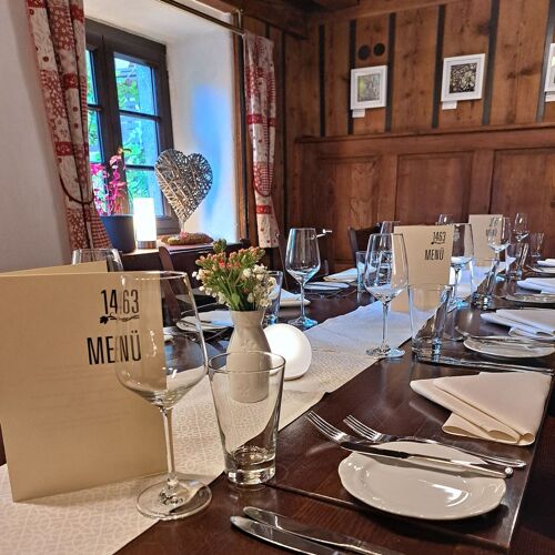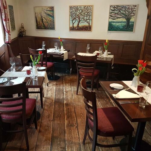 This building, dating from 1463, exudes rustic charm both inside and out. Dark wood finishings and low ceilings add to the cosy feel of the two small dining spaces on the first floor. The secluded terrace in the quiet courtyard is also delightful. Verena and Henning Weick, your cordial hosts, run the establishment as a team – she handles service, he is in charge of the kitchen. Diners can choose between two set menus (with optional wine pairings), and each course can also be found in the tempting à la carte selection. There are six lovely comfortable apartments for overnight stays.