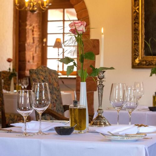 The location – the beautiful grounds of a centuries-old monastery estate surrounded by nature – is the very epitome of peace and quiet. Oozing historical, rustic charm, the restaurant serves classic, seasonal cuisine with a distinct modern influence. You can order à la carte or opt for the set menu (up to six courses). The service is competent and friendly. The terrace with a view of the Odenwald forest is particularly pleasant, and the well-stocked vaulted wine cellar dating back to 1524 is also worth seeing. For an overnight stay, the Der Schafhof hotel has well-kept guestrooms. Be sure to take a look at the collection of carriages.