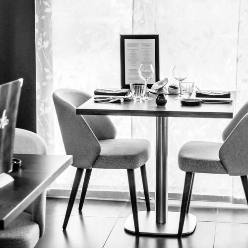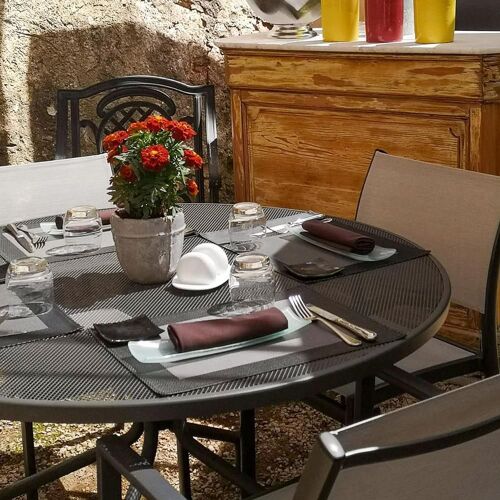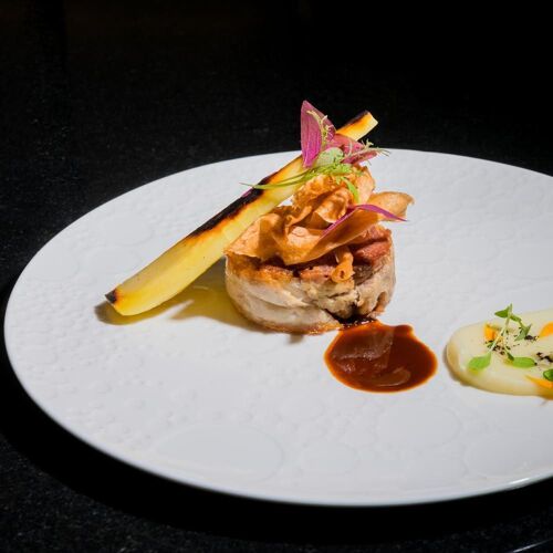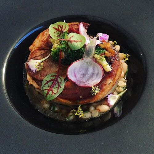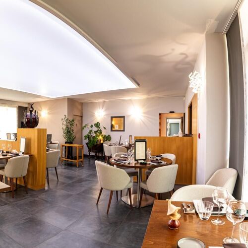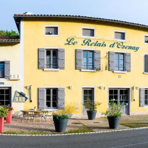 In the picturesque medieval village of Ozenay, you cannot miss this colourful fronted inn. The contemporary interior provides the perfect foil to well-crafted cuisine by a chef who boasts a fine CV. His plating is particularly precise and flowery. Examples include velvety green peas, poached egg and an emulsion of smoked bacon. Fine view of the castle from one of the venue’s two terraces.