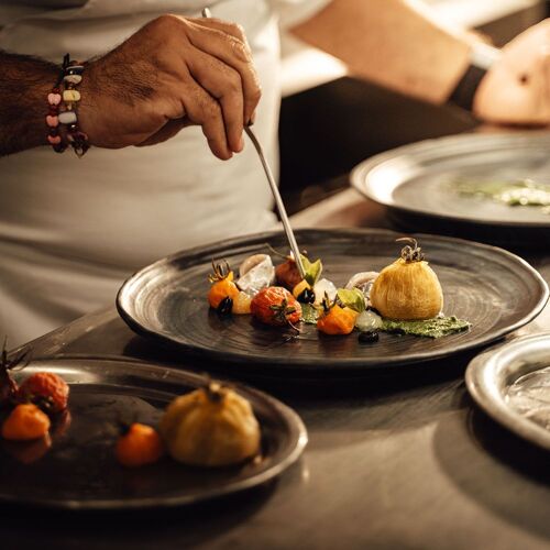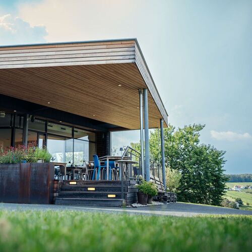 Set in a gorgeous location amid the vineyards, this is an interesting concept combining a restaurant, bistro and charming wooden bungalows for overnight stays. The restaurant is contemporary in style and serves a modern four- to seven-course set menu featuring bold dishes that are brimming with flavour. Nab a table by the floor-to-ceiling windows and take in the stunning views. Tip: At weekends, you can also eat here at lunchtime – there is a smaller à la carte selection including dishes from the evening menu, plus classics such as clear beef soup with liver dumplings.