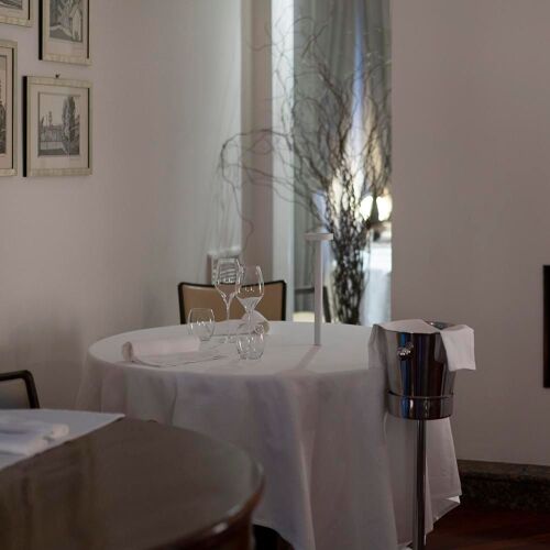 This restaurant with a low-key, hushed atmosphere has the feel of a tastefully furnished private home, with an open fire lit in winter and a cool, welcoming outdoor dining space for the warmer months. The restaurant has built up a well-deserved reputation for its fish dishes, although the menu here is equally divided between fish and meat. Options such as anolini in brodo (filled pasta in broth) pay tribute to the region’s traditions, while most of the dishes served here are highly creative. Originally English, the owner’s wife runs the front of house with skill and a warm, friendly manner. The wine cellar is home to more than 700 of the best Italian and international wines, with a curious emphasis on labels from cooler climes.