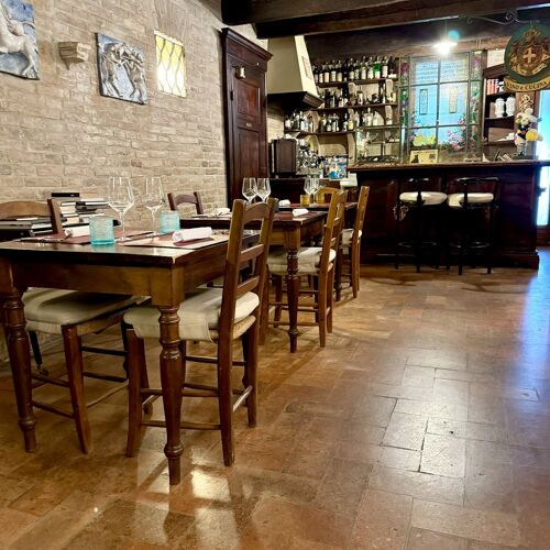 This building, home to the San Bartolo Knights Templar “hospital” until the 13C, now houses an attractive restaurant which continues this old tradition of hospitality. Here, a friendly dining room with a pleasantly rustic yet elegant feel serves as a backdrop for generous, substantial cuisine with a hint of creativity. An outdoor space shaded by a vine-planted pergola completes the picture.