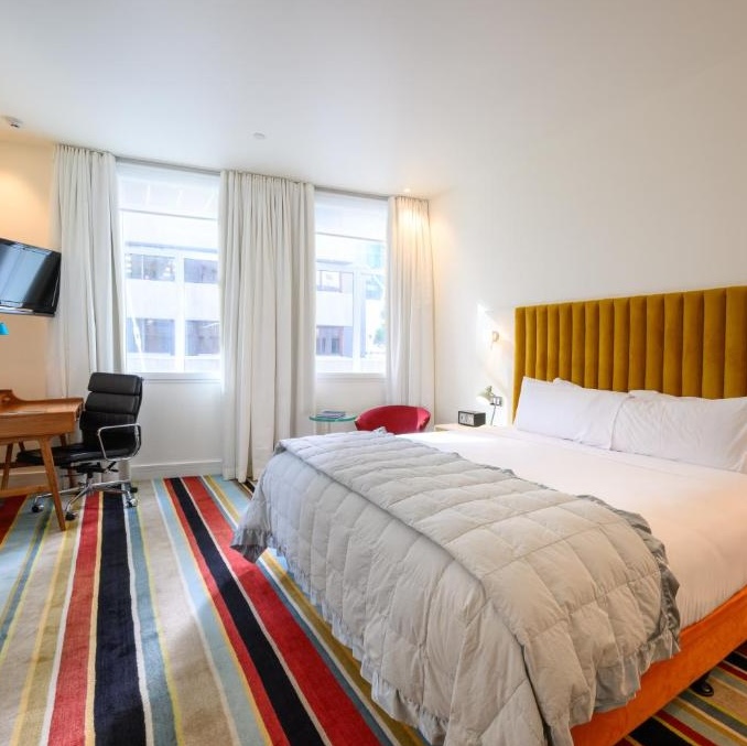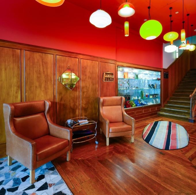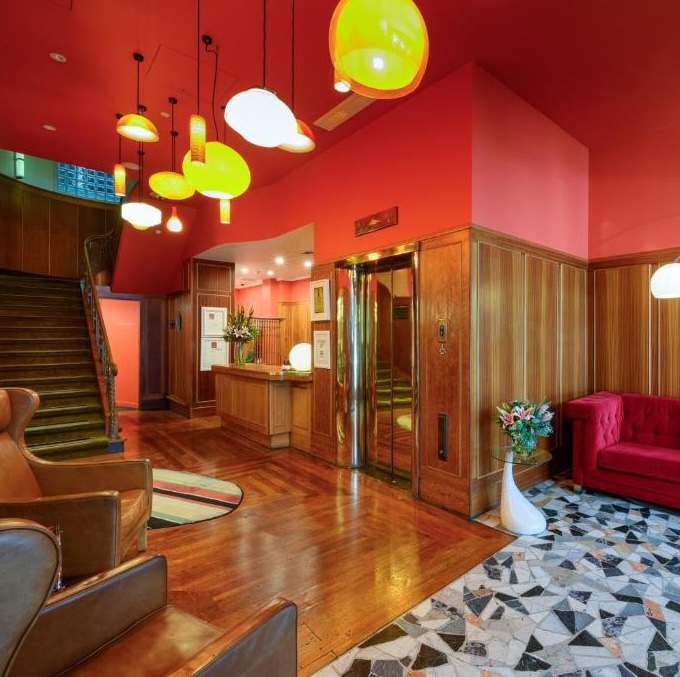 In its new incarnation it reflects High Street’s creative, eclectic character right back at it, thanks to its new owners, John Courtney and Michelle Deery, the latter of whom actually served as the hotel’s interior designer. Her signature is most visible in the wildly patterned, brightly colored carpets, but extends throughout, down to the inspiring contrast of mid-century modern furniture and Art Deco architecture.