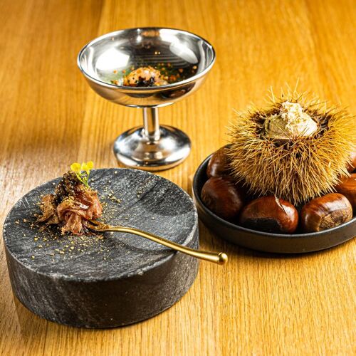 The oldest house in Paris (1407) is named after alchemist Nicolas Flamel. In a pared-back contemporary interior enhanced by its old stones and beams, the high-flying kitchen brigade of Alan Geaam is hard at work crafting premium ingredients into harmonious dishes in tune with the zeitgeist: "chef's garden", carrots, apricots, peas and chervil; saddle and sweetbreads of lamb, aubergines and plums; poached peaches, Earl Grey tea and almond milk.