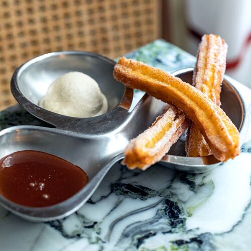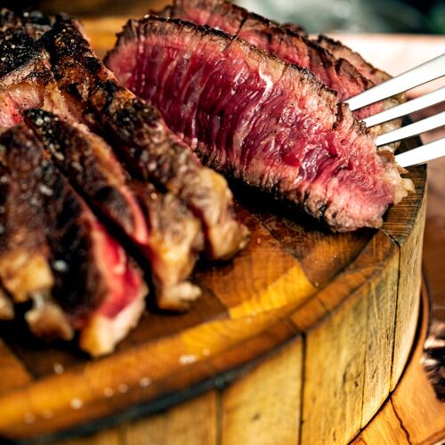 Mouthwatering dry - aged meats – Baltic black beef, Bavarian beef, Blonde d'Aquitaine, Black Angus – take pride of place in the window, drawing in diners keen to try them for themselves. From the starters to the desserts, everything is cooked over coals or roasted on a spit, giving the dining experience its own particular flavour. A great success.