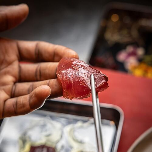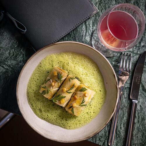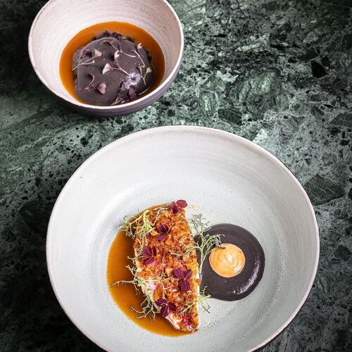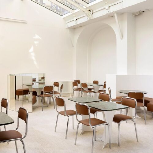 This restaurant is tucked away at the back of a fashion and design concept store showcasing young designers. Behind the wooden door, light flows through the glass roof into a space with an open kitchen and a bare concrete floor. A veritable cultural hub, the basement includes a small exhibition room, a cocktail bar and a table d'hôte. In the kitchen, chef Victor Blanchet (who was a contestant on French TV's Top Chef in 2023 and has also worked at L'Arpège and Neso) is inspired by the Mediterranean and the Basque Country – serving dishes that are colourful, light and well composed, such as sea bass tataki flambéed with pastis, beetroot mousseline and preserved lemon. Online bookings only.