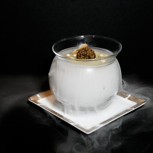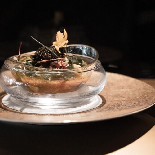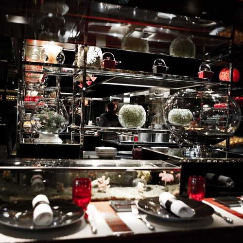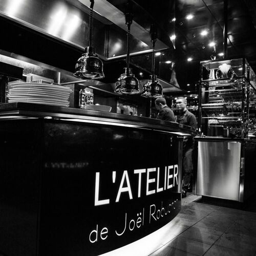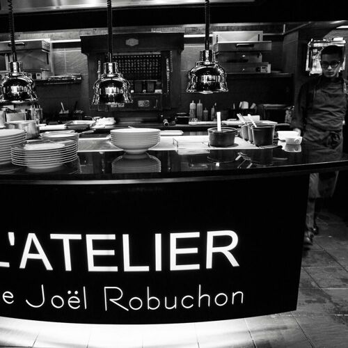 Bathed in a studied semi-darkness, two bars face each other around a central kitchen where the dishes are prepared under the gaze of the guests, seated on high stools at the counter. This "chic canteen" is a Western version of Japanese teppanyaki and sushi bars, with a menu that can be “tailored” into small portions and plates that boast superlative ingredients. Caviar on a soft-boiled hen’s egg and smoked salmon in puff pastry and the house staples, king crab ravioli, suckling lamb chops, Joël Robuchon's famous mashed potatoes...