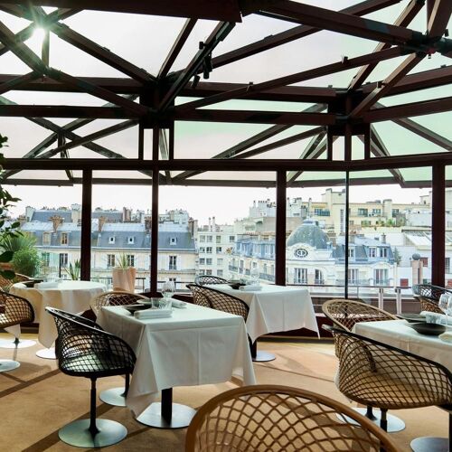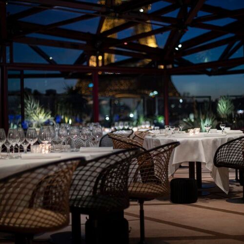 On the roof terrace of the Musée Quai Branly – Jacques Chirac, this entirely glass-sided restaurant boasting interior and exterior architecture designed by Jean Nouvel overlooks the nearby Eiffel Tower. The menu, supervised by Alain Ducasse, is skilfully executed by talented chef Alexandre Sempere, a trusted collaborator. The modern seasonal cuisine is made with fine ingredients and smacks of the Mediterranean influences beloved of its mentor.