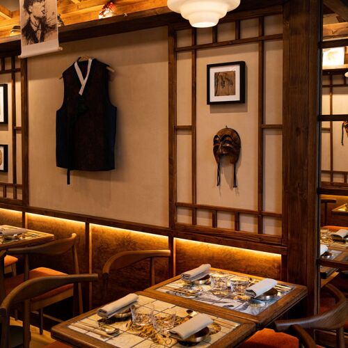 Chef Thibault Sombardier opened this Korean eatery, the decor of which nods to the traditional hanoks (houses) of the Land of the Morning Calm. The menu is extremely well devised and meticulously executed by a Korean team: beef broth with tofu, shiitake and garlic crisps; miso-glazed monkfish; toasted buckwheat cream and soya caramel. Barbecued over charcoal, the matured meats and marinated fish are served alongside the traditional banchan (small side dishes of fermented or marinated vegetables) and accompanied by well-seasoned sauces and crunchy salad leaves for diners to prepare their own ssam (wrap). There is a small and original wine list, complemented by a few Korean rice spirits.