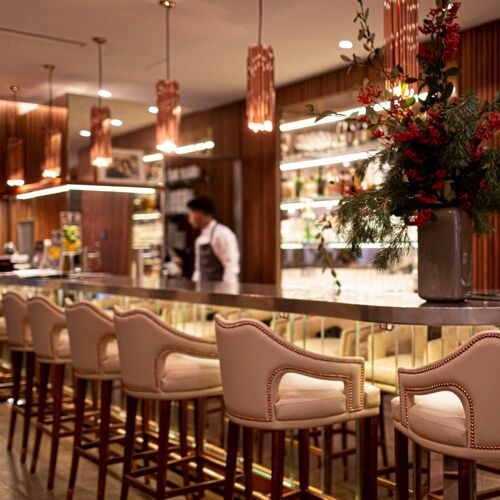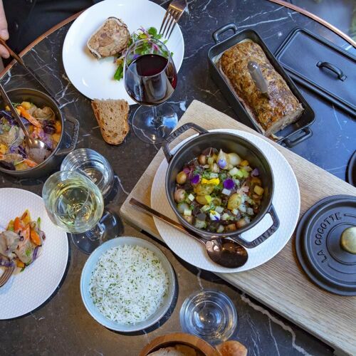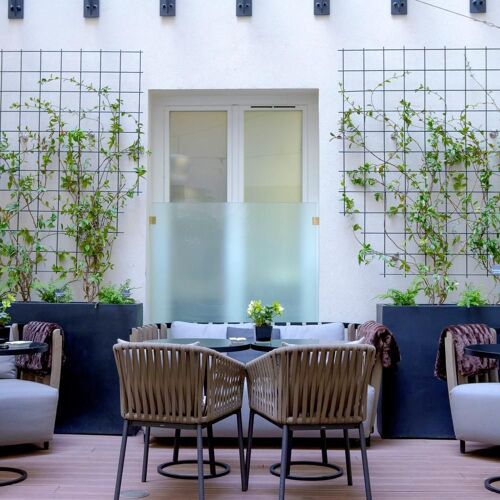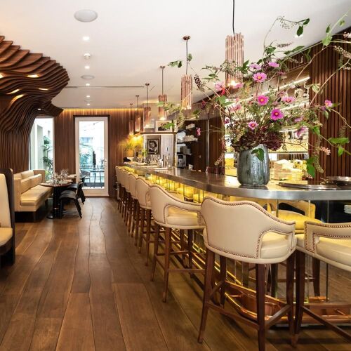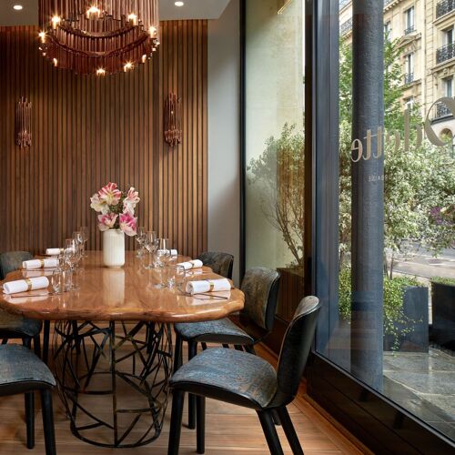 Two steps from Les Halles, in the luxurious Albar Hotel, the Rostang family demonstrates that they haven’t lost their touch in this urban inn. Odette regales us with succulent dishes to be shared: seabass in a pastry crust, one of the house signatures, veal cutlets, roast guinea fowl. Her score is spot on and dotted with fanciful notes, like veal belly paired with Gala apples or lightly seared scallops with parsnip and cashew nuts. The addictive desserts are to die for, illustrated by a hazelnut and pistachio millefeuille sprinkled with confit of orange zest.