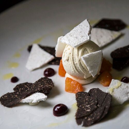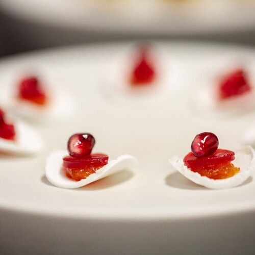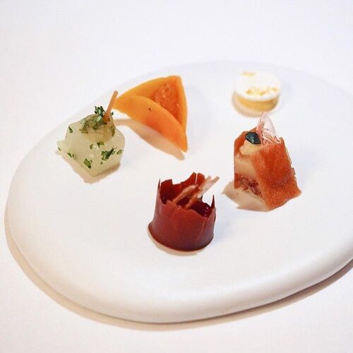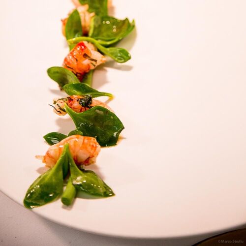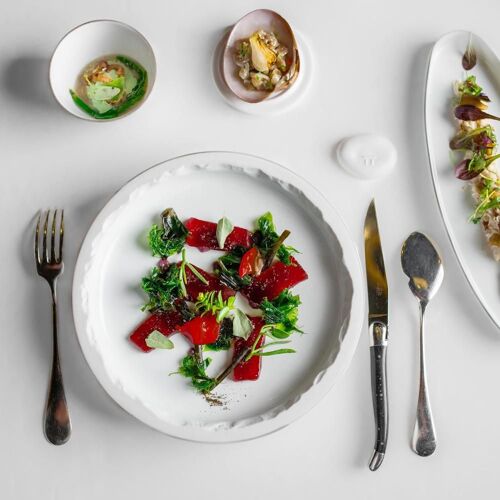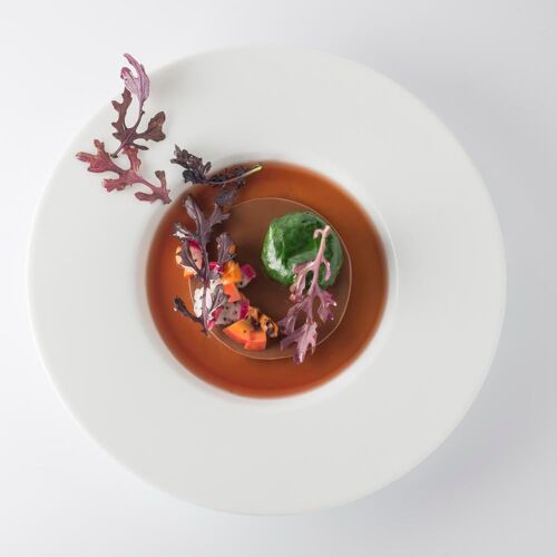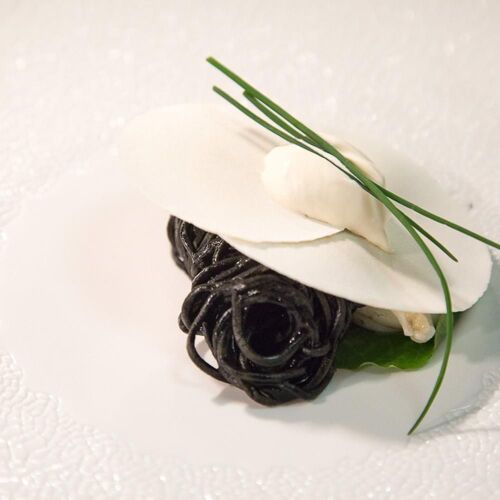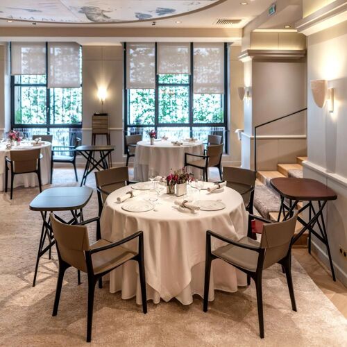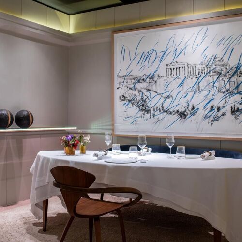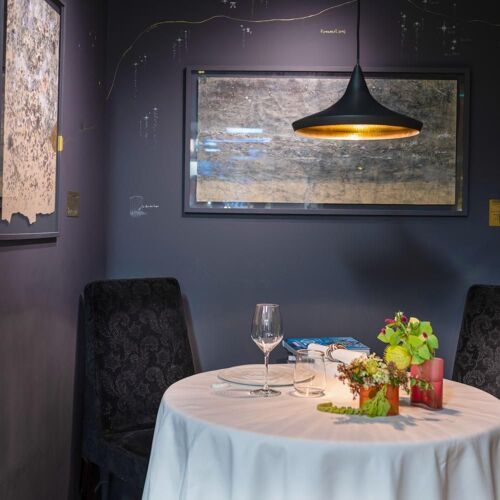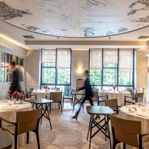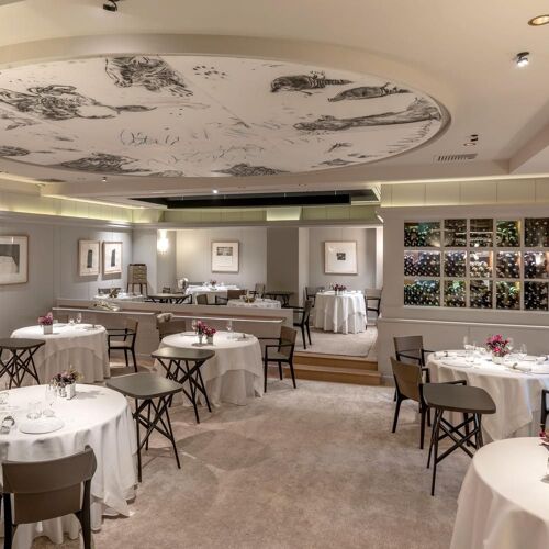 In an interior dominated by a masterful charcoal work, an "urban cave painting" depicting a bestiary by the artist Adel Abdessemed, Pierre Gagnaire continues to finetune France’s culinary scene with his adventurous, wholehearted and excessive signature cuisine. This fan of jazz and contemporary art never rests on his laurels. Gagnaire's restaurant, which has had three stars since 1996, reflects his character: modern, understated and subtly sophisticated, all of which is in perfect harmony with the service. The poetic dishes are constantly reinvented, like small "satellite" portions sent into orbit by the chef, making it impossible to cite a single emblematic dish, or even a main characteristic – other than sheer excellence!