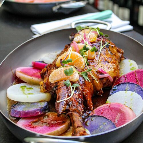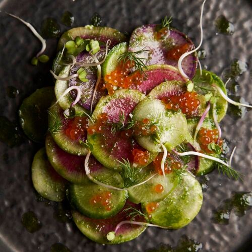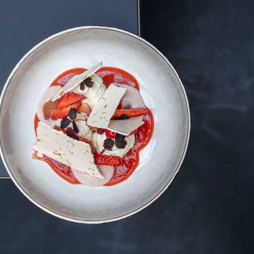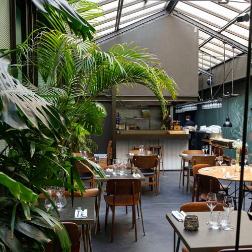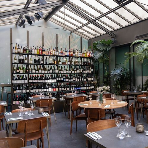 A corridor leads to this restaurant, established beneath a glass roof in the courtyard of an old Parisian building, whose vibe is part winter garden, part neo-industrial. Youthful Louis Gallet works wholeheartedly and effectively to transform carefully selected ingredients: egg parfait, lemon confit-flavoured houmous; barbecued Simmental steak, Choron sauce; chocolate and blackcurrant-flavoured sponge cake. The main dishes are to share (bellota pork, chimichurri sauce; Basque veal cutlet with Choron sauce). Well-curated, sensibly priced wine list.