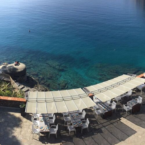 Just a few minutes' walk from the centre, slightly uphill, and from the indispensable public car park, we are in a restaurant in full marine style, literally clinging to the cliff, with a wall carved out of the living rock. From the upper terrace (reservation strongly recommended!) the view is breathtaking, while the cuisine, very generous and rich in ingredients, honours the sea without forgetting the land, as in the best Ligurian tradition. The dishes on the menu are updated daily with alternatives by voice or blackboard.