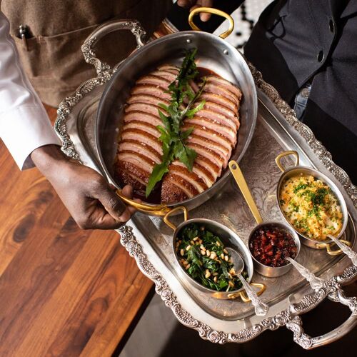 The open kitchen is a true-to-life stage for this team, who can be seen prepping, cooking, and putting the finishing touches on a series of Mediterranean-style plates. Pasta is a must, as in the conchiglie with a luscious clam sauce. Shelled clams, bits of bacon, and sesame breadcrumbs complete the delightful preparation. Lamb is a springtime treat when dressed with green garlic persillade and young onion soubise. Caramelized apple atop buttery cake with crème fraîche and green apple brunoise is a fine finale to the array of impressive cuisine offered here.