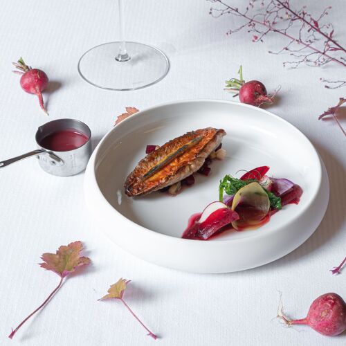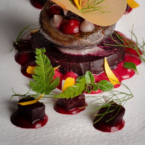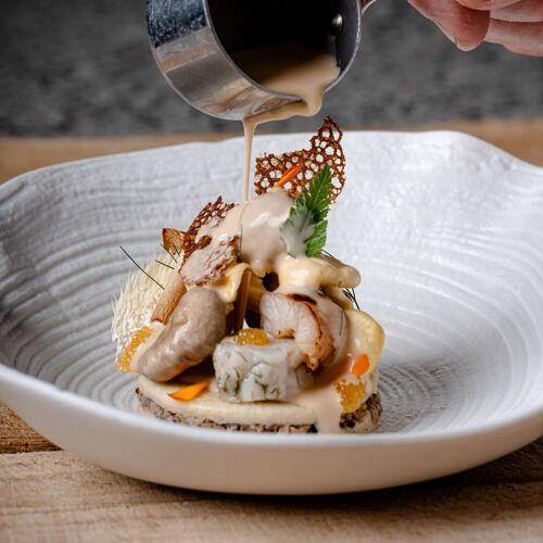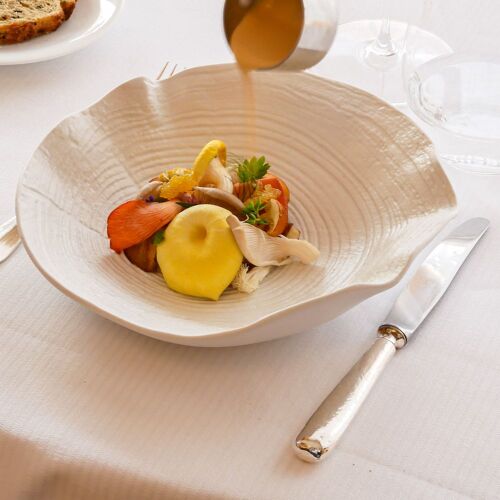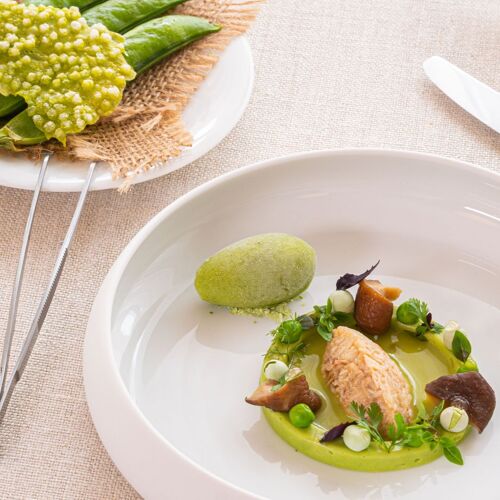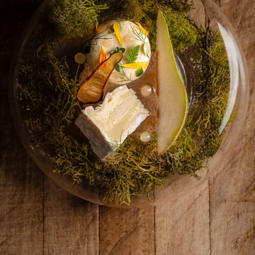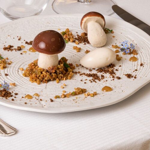 The huge forest of Andaine surrounding this restaurant, depicted by light wooden wainscoting and a leafy terrace, is undoubtedly its ‘raison d’être’. Poised between Maine, Normandy and Brittany, these green lungs nurture and nourish the forest-inspired cooking of chef Franck Quinton. His way with mushrooms is out of this world: roast cèpes in thyme and laurel, girolles sautéed in rosemary, apricots and hazelnuts, chanterelles in cream of foie gras and parmesan or horn of plenty with ham and ciboule onion… If you stay the night, you can even go picking with him! This wholehearted chef is also a champion of local produce and his pigeons, veg and meat all come from within a few dozen kilometres. Delicate, appetising food served in an elegant, peaceful interior: heaven!