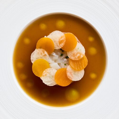 He may pair a warm tartare of langoustine with a frothy langoustine bisque and a tapenade of piquillo pepper, fresh spinach pasta and a shellfish oil of piquillo and capers. The chef’s polished craftsmanship and generous nature are escorted by a series of more modern twists and contrasts that add a kick to each dish.