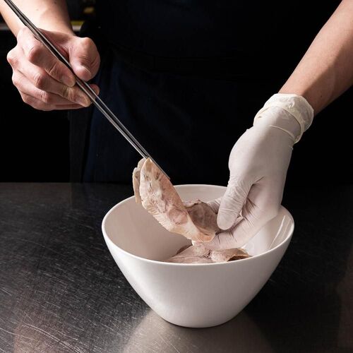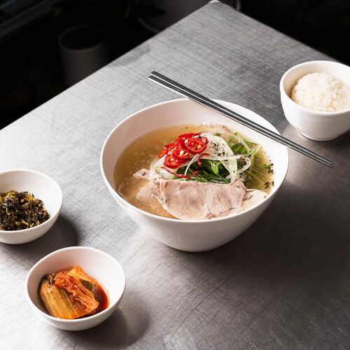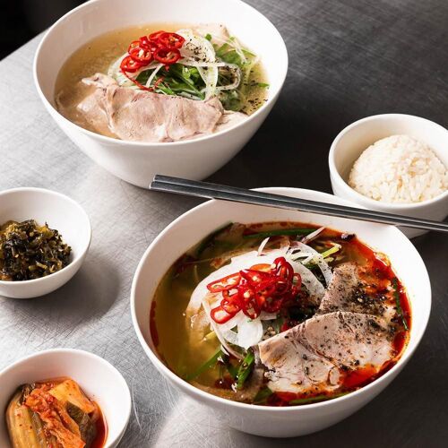 A seven-seat stainless steel table and an open kitchen are all there is to Jeongmyeon, which means “noodles infused with meaning.” This one-chef operation serves noodle soups with meat. White noodle soup and red noodle soup are the only two dishes on the menu, but both offer deep flavor profiles. The broth, made with seafood, pork, and chicken, reveals a rich set of tastes. Garnishes topping the rice noodles, including thin slices of pleasantly chewy pork, onion, and red pepper, are truly a sight to behold. The red noodle soup, which can be made with varying levels of spiciness, is served with a bowl of rice for a filling meal.