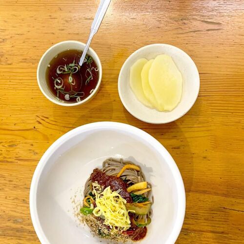 For over 50 years, this family-run eatery has been serving bowls of noodles to those seeking comforting nourishment. The fresh buckwheat noodles, one of its bestsellers, are made from scratch, daily, using premium salt from Bigeumdo Island in Sinan County, and buckwheat flour from Bongpyeong. Topped with seasoned vegetables, thin strips of egg garnish, and a dollop of sweet and spicy sauce, a bowl of these noodles makes for a satisfying meal. Garak-guksu, wheat noodles in piping hot broth, comes with a generous serving of fishcake.