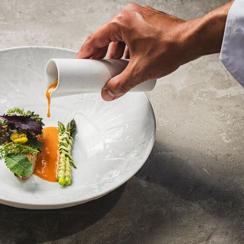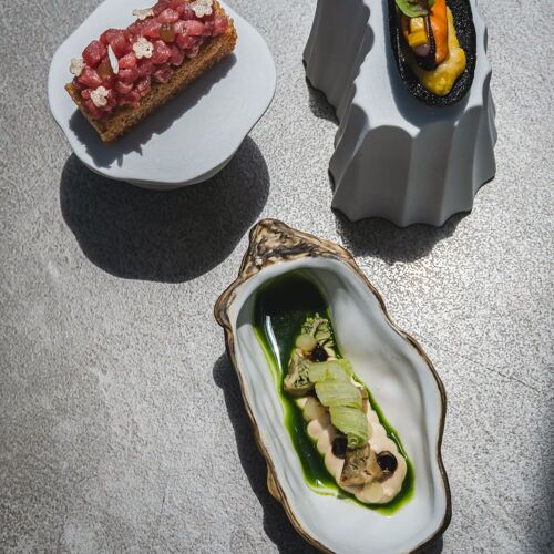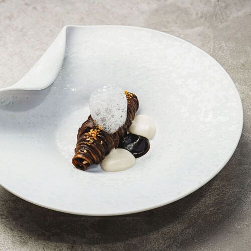Although there is an extensive à la carte at this restaurant, it is on the tasting menus that the chef showcases his creative cuisine to the full. His Suggestioni menu features dishes such as scampi carpaccio with green apple and caviar, while the vegetarian Naturalmente option includes a robustly structured black garlic and almond noodle dish full of decisive flavours, which is well worth trying. The romantic, modern platform where tables are set out is practically on the beach, which means that the restaurant is closed in bad weather.