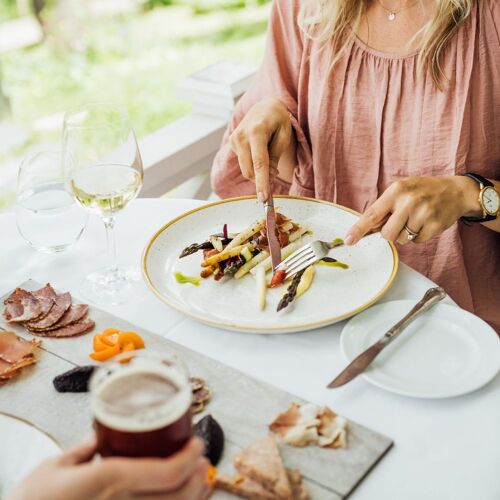 In this bistro, which complements Manoir Hovey's fine dining restaurant, old tools and rustic objects decorate the walls (a rifle, a bow, a canoe, snowshoes, skis, and a saw), making for an inviting and authentic atmosphere. The traditional cuisine with a twist continues in this vein. On the menu: bison tartare accompanied by ribbons of cucumber and celery finished with a black garlic balsamic vinegar gel; scallops come as a carpaccio with lovage oil, or seared with cauliflower, citrus supreme, capers, and gingerbread crumble. It has all the makings of an enjoyable dining experience.