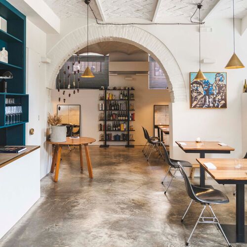Housed in two small dining rooms connected by an arch on the ground floor of an old palazzo, this restaurant is decorated with materials that give it a minimalist feel – a combination of stone, wood and iron in the tables, glass in the mirrors and bottles on display, and paper in the books arranged in small niches, just like the lounge of a private home. There are just 20 seats in this warm, intimate and unfussy restaurant, as well as a large counter separated by an arch at the entrance which precedes the recently restructured kitchen. Observation of his own region has shown owner-chef Luca Fracassi that the varied geography of his province is an inexhaustible source of inspiration. As a result, he has embarked upon an impassioned search for ingredients that best showcase the region, combining these in dishes that not only respect the flavours of his produce but also revive traditional local techniques and include the occasional oriental influence. His cuisine is modern yet eschews modern trends, paying careful attention to integrity of flavour and zero waste. In this way, the kitchen becomes a place in which wild ingredients and forgotten flavours are rediscovered and brought back to life. This focus on lost traditions combines ingredients such as snails and game (often neglected in urban restaurants) with a skilful and updated use of contemporary culinary techniques.