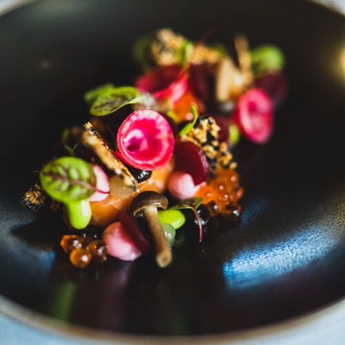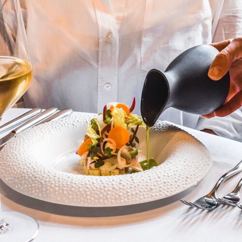 This imposing historic farmstead, opposite the vineyards of Chateau Vandeurzen winery, is depicted by a stylish interior, whose centre piece is a sculpted flock of birds in flight that is most eye catching. The estate’s excellent wines are paired with a Gallic lineup of contemporary leaning. The chef enjoys pairing sweetbread with truffles or pheasant with Fine champagne cognac, adding a personal twist along the way by playing with the tangy freshness of ingredients such as kalamansi, yuzu and wine vinegar. It has proved a hit with fans of familiar flavours who appreciate an added twist.