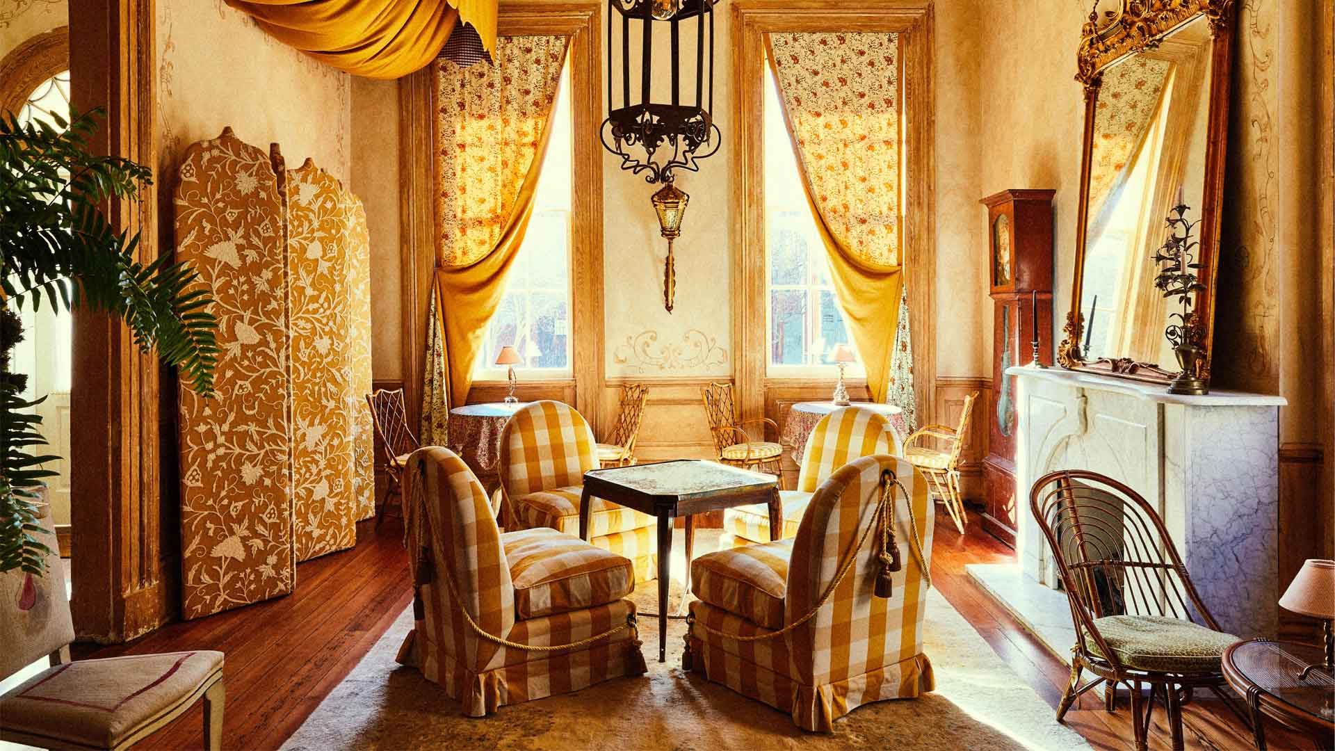 Lush and moody rooms in the historic building at Columns. ©Columns