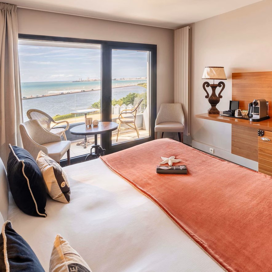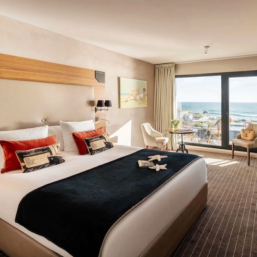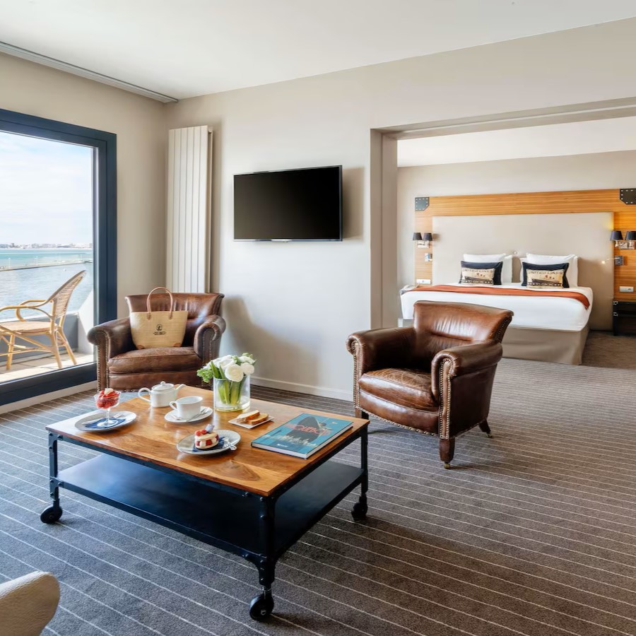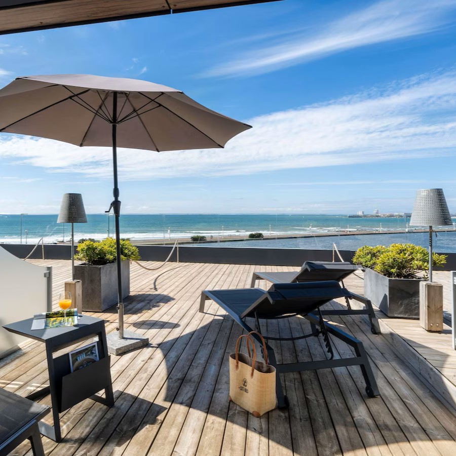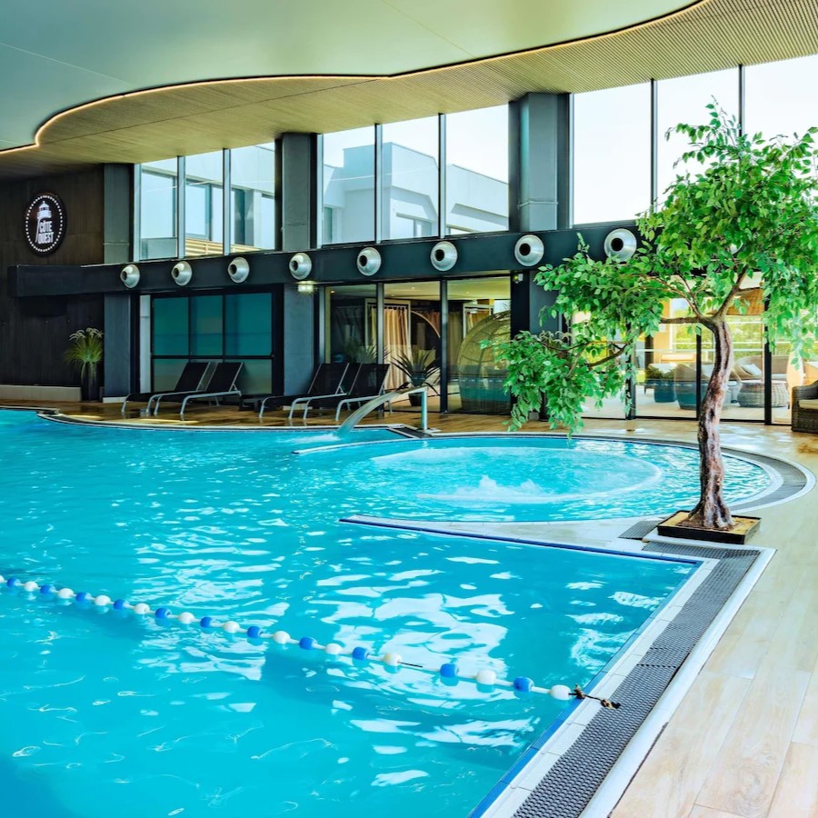 Côte Ouest Thalasso doesn’t just look across the Atlantic Ocean, it feels like you might be sailing across it with its 1930s ocean liner-inspired design. Rooms and suites take their cues from ocean liner cabins and come with a mix of bay windows and balconies to highlight the views of either the water or surrounding forest. The theme continues in Bar Cote Ouest, furnished with leather-clad armchairs and nautical touches, while restaurant Cote Ouest naturally serves a seafood-driven menu that changes according to daily catches from the local market. It’s the Thalasso center that’s the highlight though, a vast 1500 sqm wellness space specialized in thalassotherapy and fully equipped with heated indoor and outdoor seawater pools, Jacuzzis, numerous treatment rooms, including three overlooking the ocean, plus a gym, hammam, sauna, and aromatherapy room.
