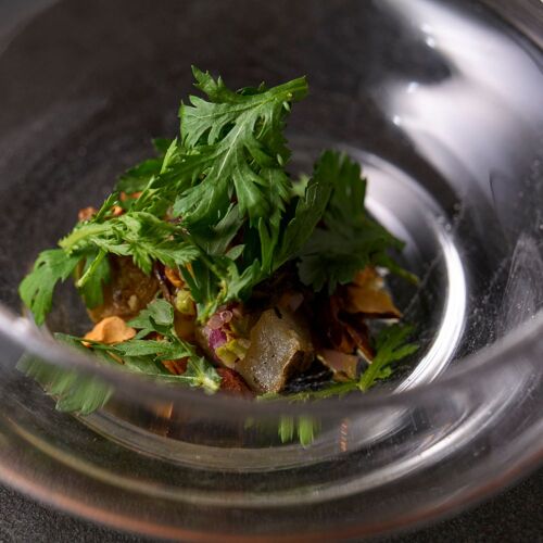 Ken Sakamoto exults in expressing Italian cuisine through the bounty of Japanese produce. Putting kombu kelp, bonito stock and fermented ingredients like malted rice miso and sake lees to effective use is how he preaches the gospel of Japanese cuisine. Cured hams and cheeses arrive from producers who share the chef’s passion. Nonstandard vegetables are used in fermented form; pruned citrus fruits garnish lend a sour piquancy as garnish. Food that brings people together in every sense.