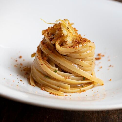 In the historic upper section, close to the namesake church, lies one of the most compelling culinary offerings. Within rooms exuding a modern and essential vibe, blanketed in dusky evening lighting, Marco Baglieri’s excellent cuisine becomes sophisticated and almost baroque, paying homage to the urban style of one of Sicily's most enchanting cities. Both the artichoke cooked two ways on brioche with anchovy sauce and the cod with leek foam and cuttlefish ink, embellished with black truffle and basil oil—sampled on our last visit—were exceptional. The scope also extends to meat and vegetarian dishes. The exterior proudly displays a glass-walled cellar showcasing the breadth and order of its selection.