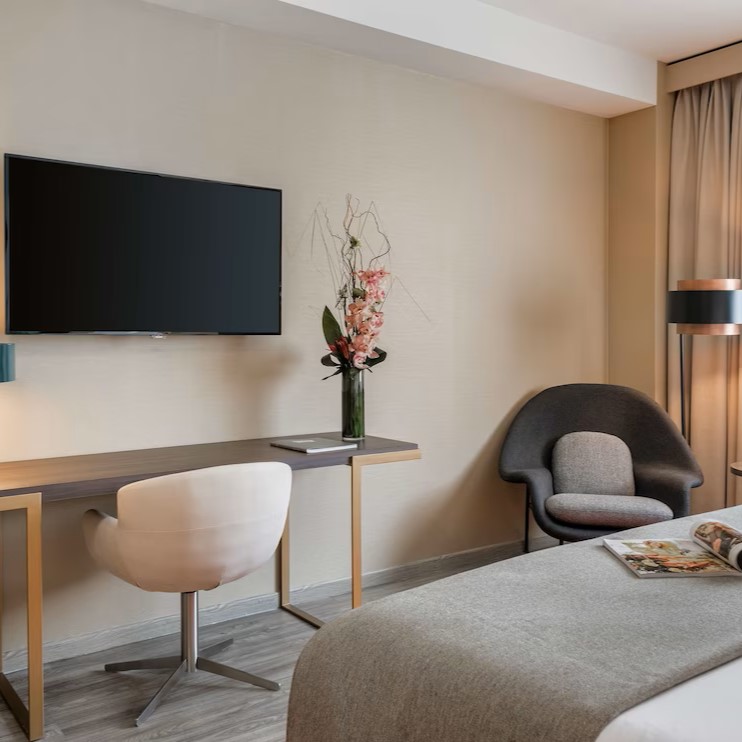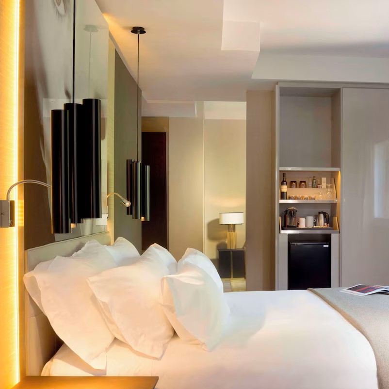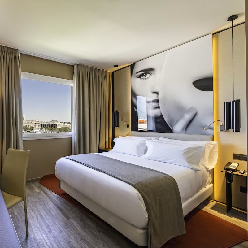 Fast-forward to the present. After extensive renovations, the hotel reopened in 2016 as the NH Collection Madrid Suecia. And while it’s true that some of the hotel’s period charm was lost in the process, we have to admit that we like what they’ve done with the place. The look is modern, with hardwood floors, crisp white linens, oversized black and white photos, and sculptural lamps suspended from the ceiling. The in-room amenities are nice, as well: each room or suite has a Nespresso machine, a sleek slate-lined bathroom with a rain shower, a large flat-screen TV, and free wi-fi. Some rooms feature striking views over the elegant architecture of downtown Madrid; several of the higher-end rooms and suites have enviable private terraces outfitted with chaise lounges and tables where you'll be compelled to linger over your morning pastries and café con leche.