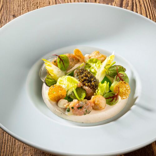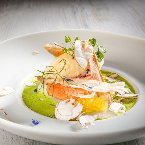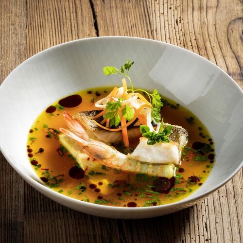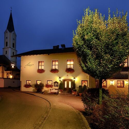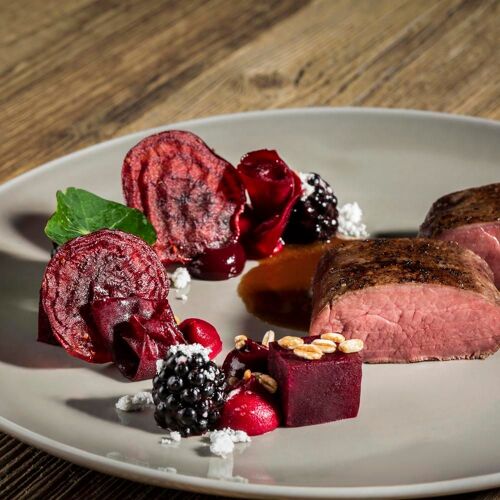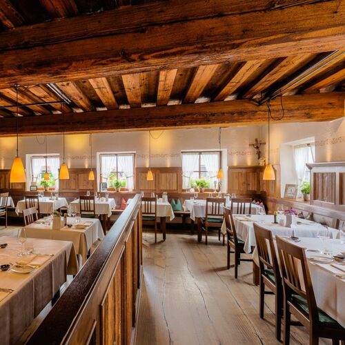 This long-established inn has been run by the same family since 1612 and is now in excellent hands with Alexander Huber. Using top-notch ingredients, the chef skilfully incorporates both Bavarian rusticity and modern sophistication into his cuisine, creating dishes that are intense and robust, but not without finesse. Diners are spoilt for choice, with dishes typical of local and regional fare such as veal lights with curd cheese bread dumplings and root vegetables on the one hand, and modern classics such as ox and pork neck ravioli with brown butter, chives, croutons, pointed cabbage and bacon stock on the other. At lunchtime, there is a somewhat pared-down menu. You sit in a cosy dining area, the front-of-house team is cordial, attentive and pleasantly down to earth, and they recommend fine wines by the glass to accompany the food. The fantastic value for money is also worth a mention. This terrific place has plenty of charm and a great atmosphere!