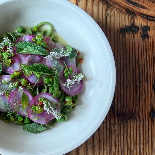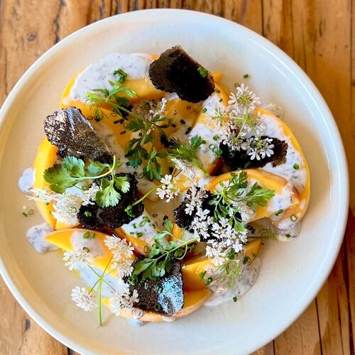 The hip staff is quick on their feet and may present diners with a salmon tostada slathered with tangy avocado purée and dots of salsa verde; or lobster chow mein garnished with charred corn and scallions. Advertised as dessert, cucumber sherbet with diced melon and watermelon granita is a perfect bite by itself.
