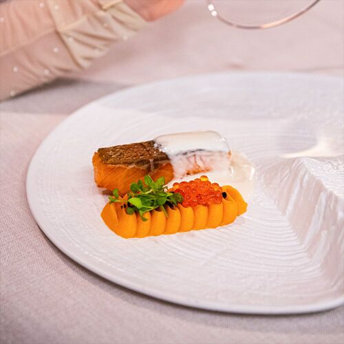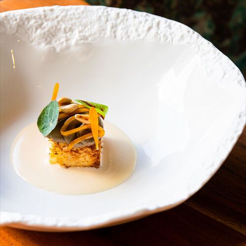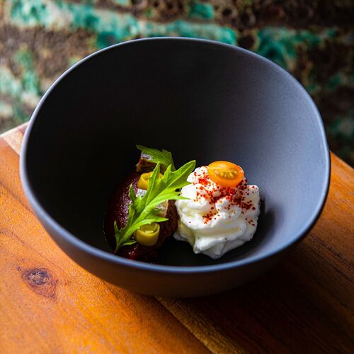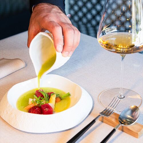 A contemporary venue with an open kitchen and designer touches, serving local cuisine and dishes from the Sierra del Segura region, brought up to date with creative reinterpretations of traditional recipes and meticulous presentation. Chef Javier Jurado, who fell in love with cooking in his grandparents’ restaurant (called Los Ángeles, hence the name Malak, the Arabic word for 'angel'), showcases his cuisine across two interesting tasting menus: 'Aldeas Perdidas' (Lost Villages) and 'Sierra de Segura'. From the moment the appetisers are served (fritters made from pork stew, acorn-fed Iberian ham croquettes made with sheep's milk, mushrooms stewed in port with Segureño garlic, etc.), we are introduced to the flavours of the mountains, reaching their maximum expression in dishes such as trout from the Aguamula River with pilpil and rinrán. Their signature dessert? Cortijo de la Vicaría cheese, quince and walnuts.