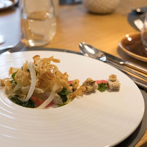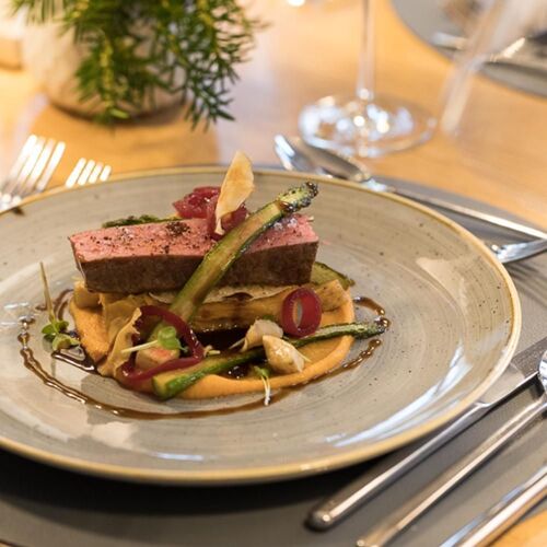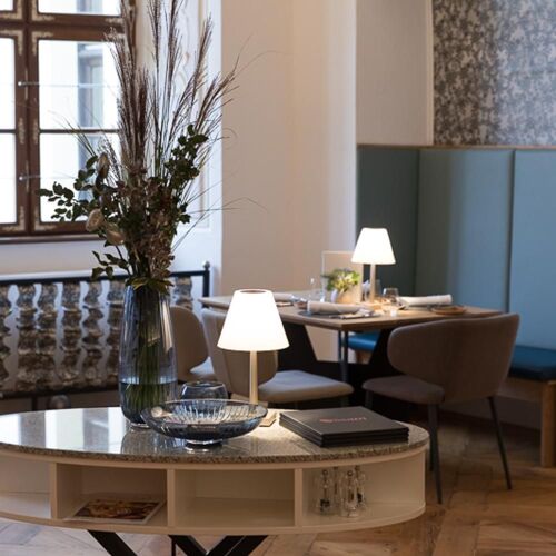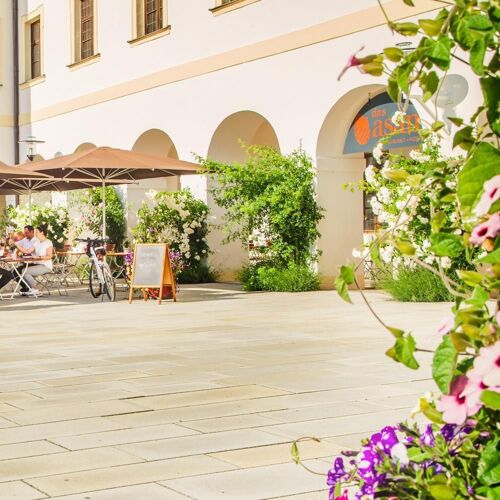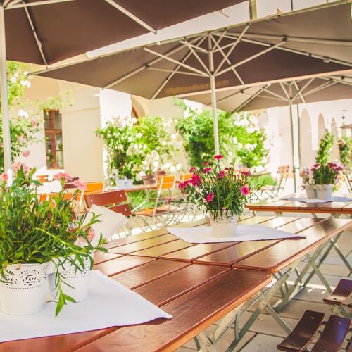 You dine in the Modlersäle, once the refectory, on the first floor of this former monastery building. It has beautiful high ceilings decorated with lovely mouldings and paintings – the historical setting is tastefully combined with an interior design of clean lines. The food is modern and seasonal, and the tasty Zwiebelrostbraten (fried beef and onions in gravy) is a classic. On warm summer days, the terrace in the cloister garden of the monastery courtyard is idyllic! You can stay overnight in well-kept, simply charming guestrooms.