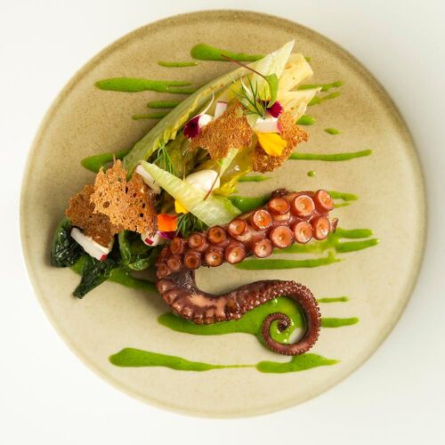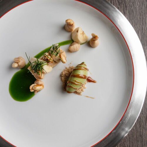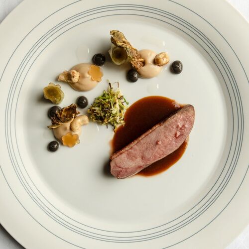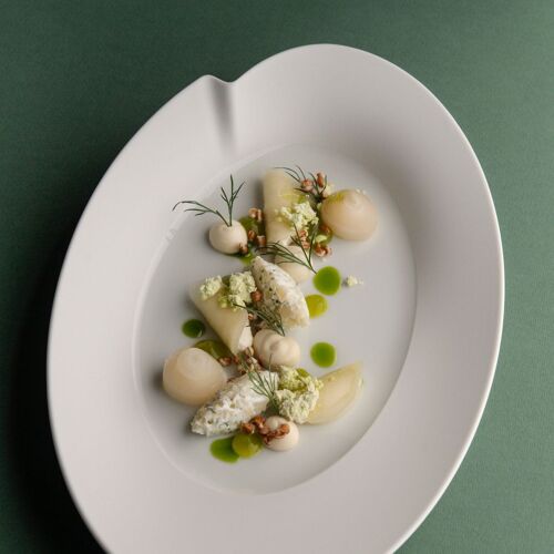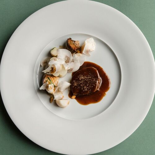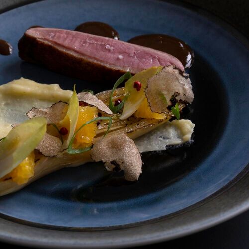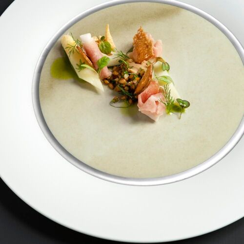 Anyone standing in front of this rather unassuming building in the Wöhrd neighbourhood would not necessarily expect to find such a tastefully elegant restaurant inside. This is Fabian Denninger's domain. Following stints at various establishments including Edsbacka krog in Sollentuna near Stockholm, Burg Wernberg and the Waldhotel Sonnora in Wittlich, he first headed the kitchen at Koch und Kellner in Nuremberg, before becoming the chef-patron of Entenstuben in June 2014. He prepares dishes based on classical foundations with a modern twist and plenty of contrasts. This is achieved beautifully, for example, in the lukewarm lobster, to which papaya and chard add a delicately fruity and acidic note. The beautifully presented set menu also comes in a vegetarian version. Tip: The quiet verdant terrace to the rear of the building is delightful.