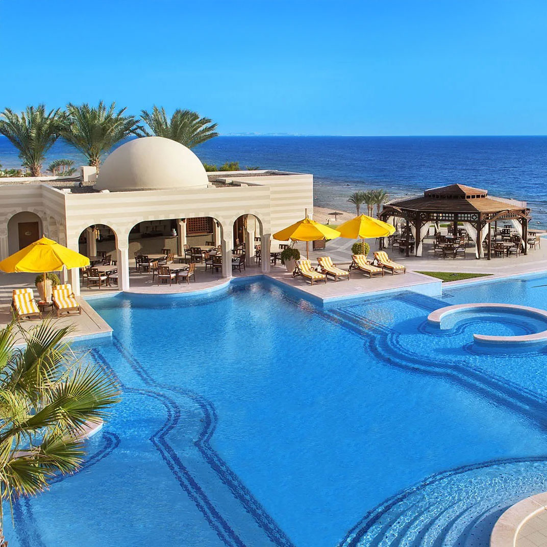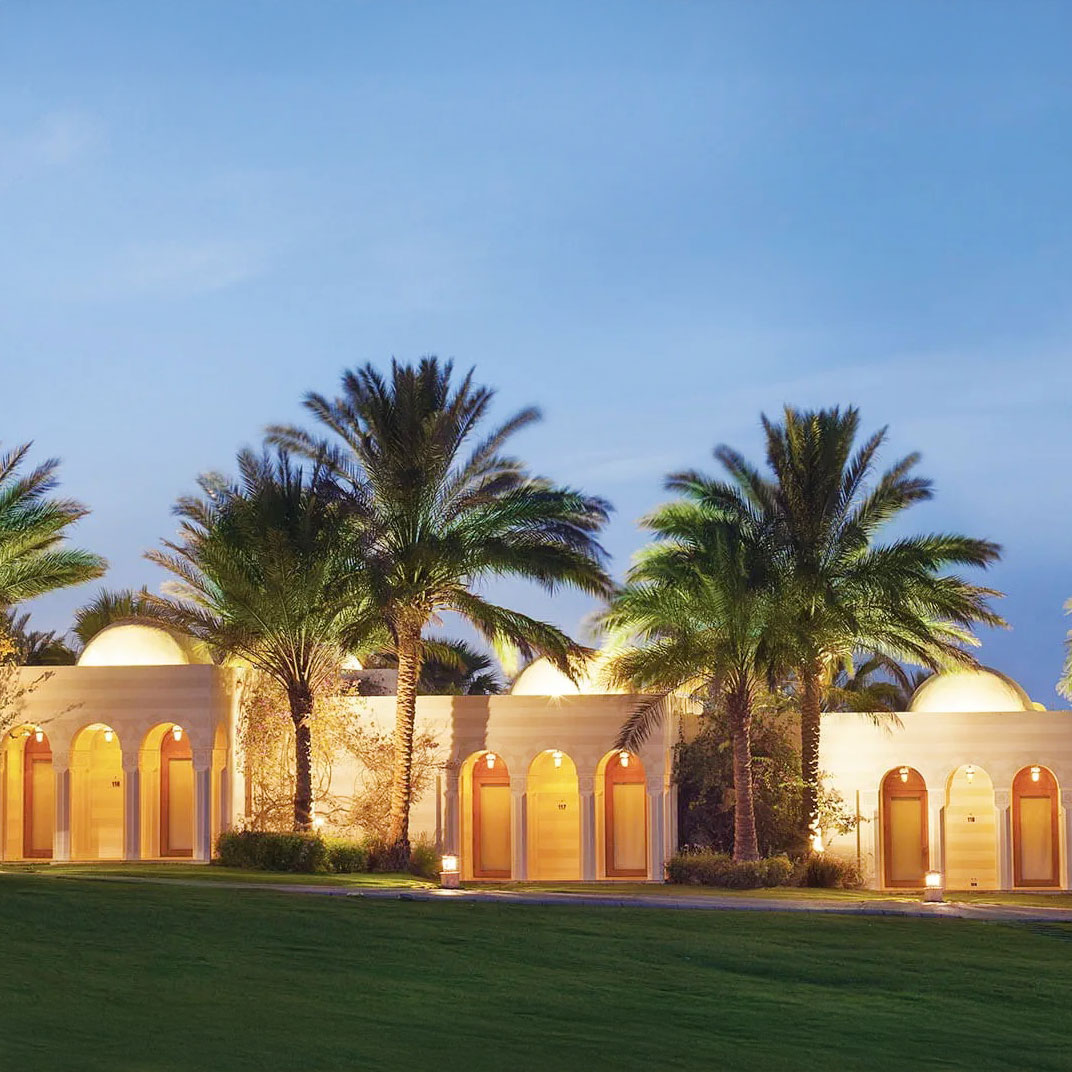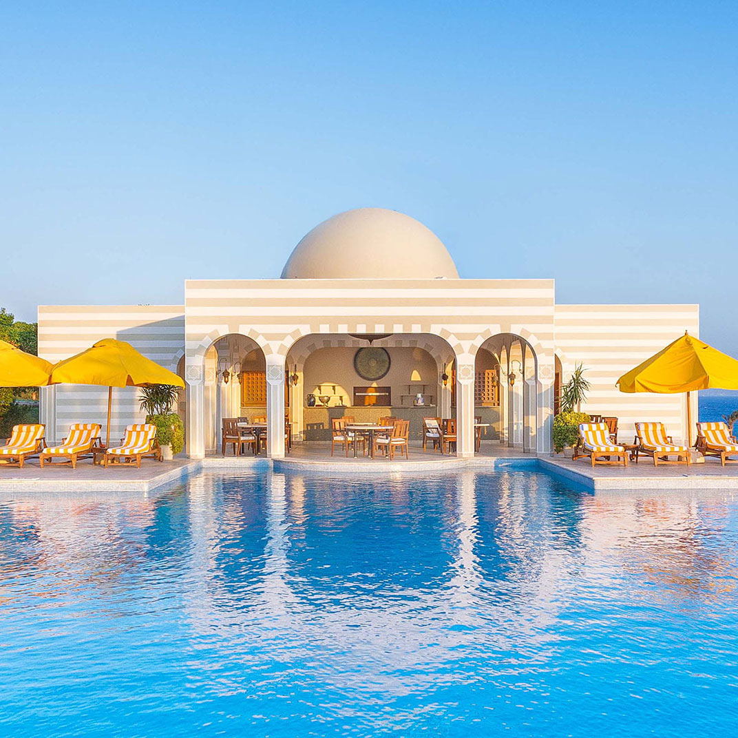 At the far end of Hurghada’s hotel strip, The Oberoi makes an immediate contrast: landscaped gardens and low-slung domed suites replace themed facades and package-holiday bustle. Each villa-style suite opens onto a private terrace, some with pools, and interiors pair high ceilings with a calm, sunlit style. The Red Sea is the constant backdrop, framed by the central pool and beachside bar. Dining is a highlight, from Indian breakfasts to freshly grilled seafood, while service: personal, polished, and unfailingly warm, remains the resort’s signature.