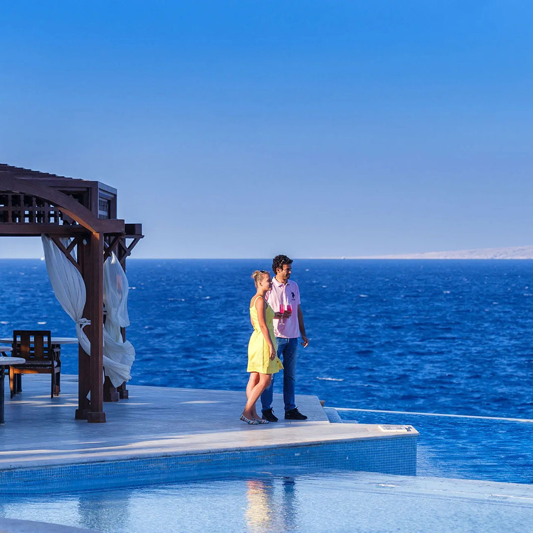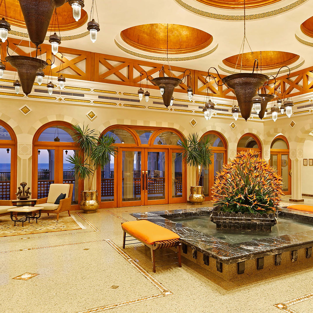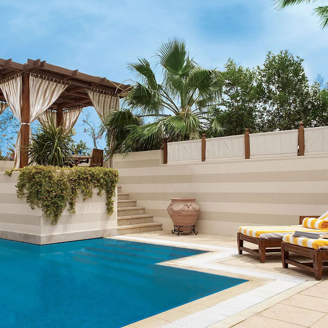At the far end of Hurghada’s hotel strip, The Oberoi makes an immediate contrast: landscaped gardens and low-slung domed suites replace themed facades and package-holiday bustle. Each villa-style suite opens onto a private terrace, some with pools, and interiors pair high ceilings with a calm, sunlit style. The Red Sea is the constant backdrop, framed by the central pool and beachside bar. Dining is a highlight, from Indian breakfasts to freshly grilled seafood, while service: personal, polished, and unfailingly warm, remains the resort’s signature.