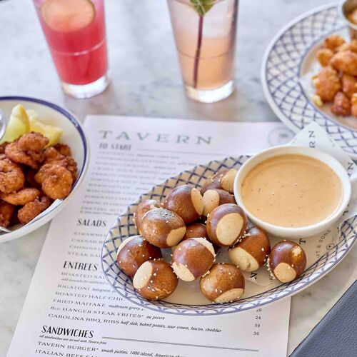 A selection of raw oysters puts patrons in the mood for seriously good food. From there, proceed to an offering of these bivalves—baked, sizzling and served with crusty bread for a heady spread. House-made pretzel bites are matched with warm queso, but save room for the roast chicken. Moist and tender, the impossibly golden brown and crisped chicken is served over spätzle and garnished with a Granny Smith apple salad for a main dish that really delivers.