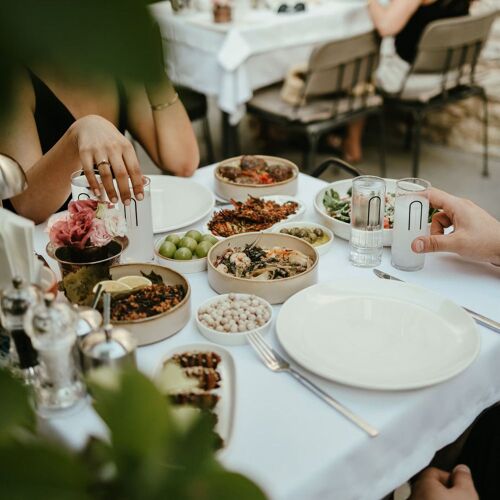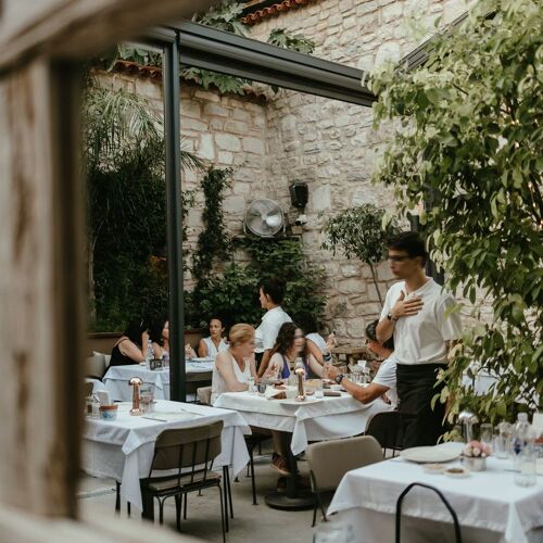 Hostess Aslıhan's friendly smile and warm welcome will make you feel right at home in this quintessentially Anatolian stone house. The restaurant's historical charm is complemented by the Mediterranean feel of the courtyard terrace. The extensive menu primarily features hot and cold appetisers with a traditional Turkish twist. Think fish soup with freshly caught sea bream, prawns and squid. Or perhaps a succulent kokoreç served with hummus, and a velvety fava bean purée seasoned with lemon and dill… These dishes brimming with flavour are perfect for sharing with friends in a casual setting.