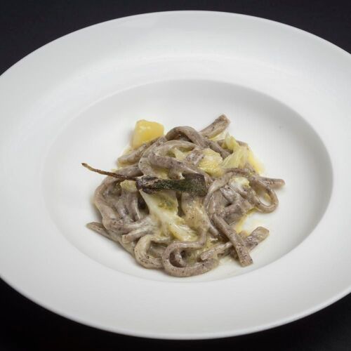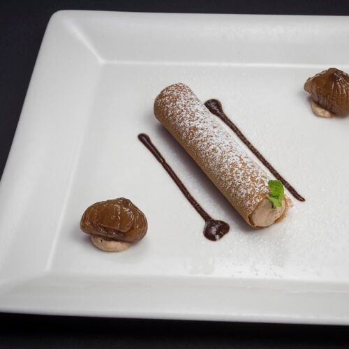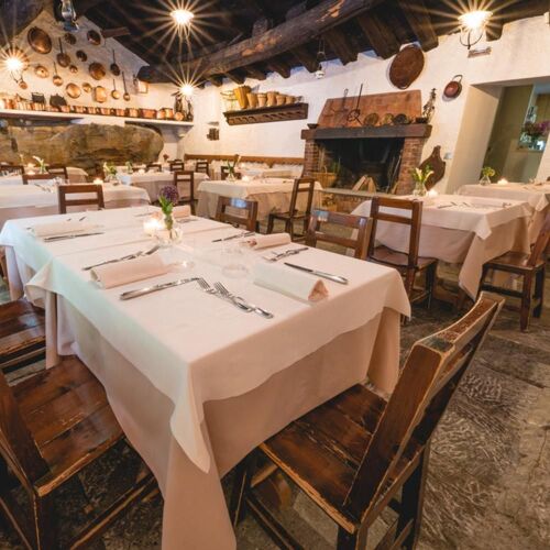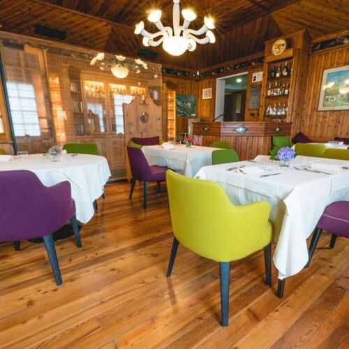 Here one can choose between a smaller, typically mountain style dining room with stone paving and open fireplace and a larger room in contemporary rustic style. In summer one can dine on the terrace.