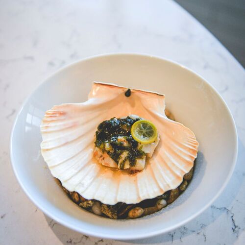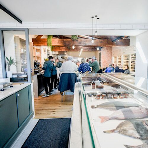 This modern seaside restaurant puts forward a hybrid concept with a fishmonger's shop displaying the catch of the day from L'Herbaudière's fish market and a minimalist space dominated by a large counter (seating 12); a few tables are set up alongside the glass-fronted wine cellar. The cornerstone of the cuisine is fish and seafood, with a preference for charcoal cooking – the menu is short and straightforward, consisting of individual plates and a few dishes to share. Sit at the counter for the ultimate seaside dining experience created by Céline and Alexandre Couillon.