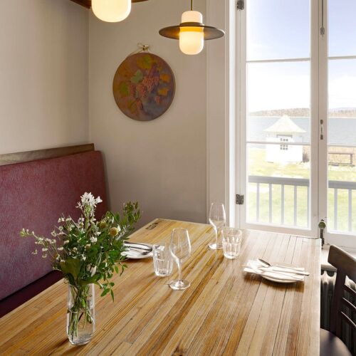 This elegant restaurant perched on the banks of the St. Lawrence boasts a charming terrace in summer. It is run by a family team, in which everyone is well versed in good food. They are open for brunch, lunch, and dinner and their set menus change with the seasons. The flavorful cuisine is firmly anchored in the terroir, a case in point being the excellent guinea fowl terrine or the delicious duck reared locally by a farmer who was once a chef here. The service is relaxed and friendly, and the enthusiastic staff are always ready to help you pick out just the right dish or wine. The adjoining store sells mostly local goods.