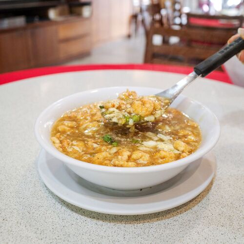 A household name for over 60 years, Amei was remodelled when it moved to this venue. Red tablecloths add colour to the wood-rich interior. The small menu is big on banquet classics and century-old recipes, combining the natural umami of ingredients with the locals’ love of savoury-sweet dishes. Rou mi xia is a thick broth of diced veggies topped with deep-fried whiskered velvet shrimps from Anping. Ask about items that need pre-ordering when booking.